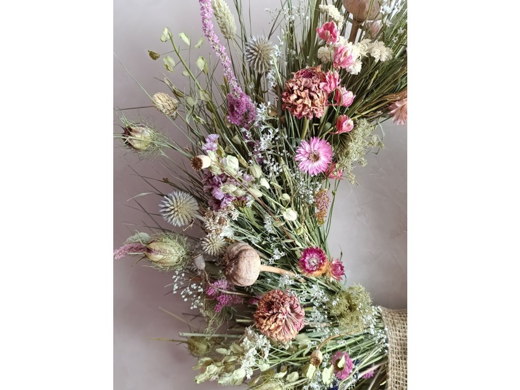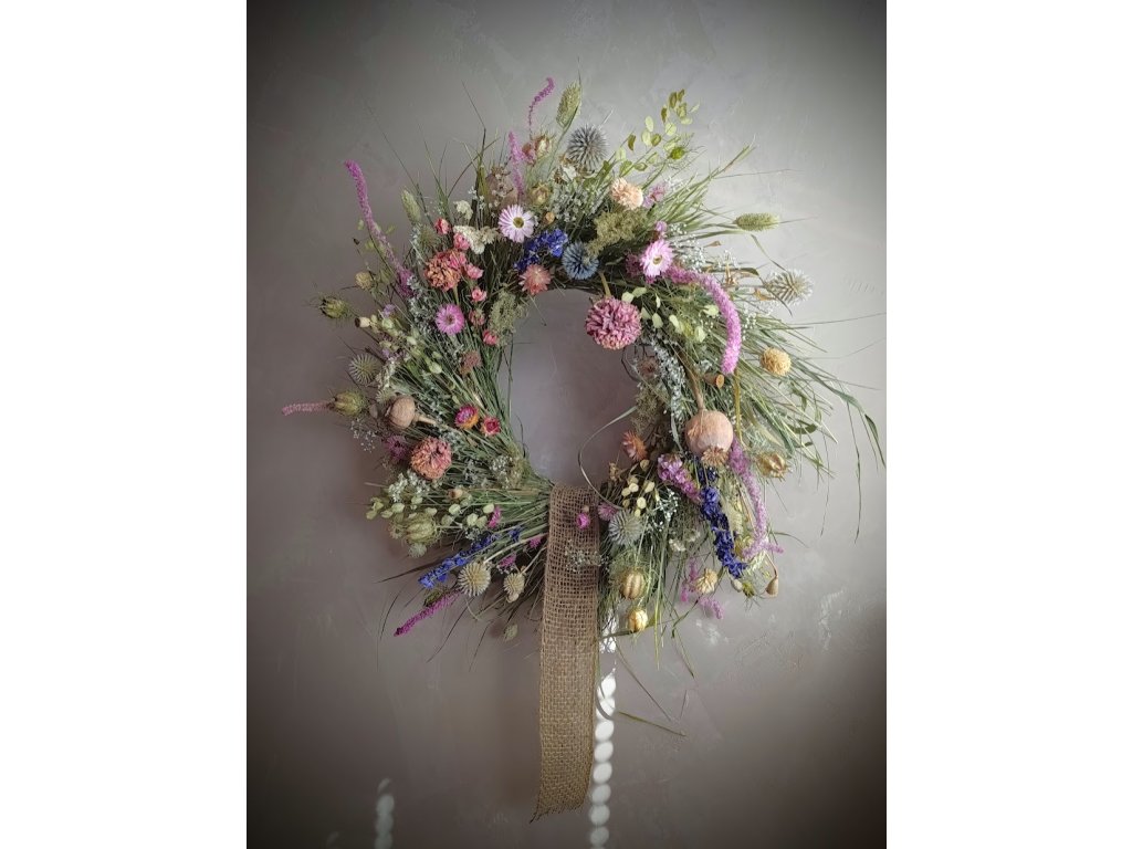 Veľký veniec v ružových tónoch. Strapatý, voľný, prírodne pôsobiaci veniec zo sušených tráv a kvetov v jemných ružových odtieňoch. Vytvorený s dôrazom na detail, aby priniesol do vášho interiéru nežnosť, romantiku a jedinečný šarm prírody.